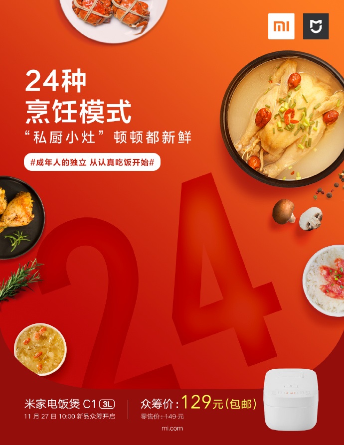 The rice cooker has a retail price of 149 yuan ($21), but under crowdfunding, it is priced at 129 yuan ($18). The crowdfunding exercise will kick off on November 27.