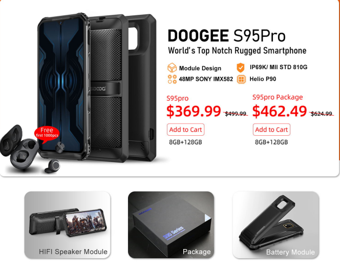 For starters, there’s their whole rugged S-Series including their flagship Doogee S95 Pro that comes with the Helio P90 SoC and 8GB/128GB or 8GB/256GB of memory configuration. Of course, all S-Series phones are waterproof, dustproof, and drop-resistant and the same goes for the S95 Pro that is available sells for just $369.99 right now on Aliexpress. There is also a package offered that includes the battery and HiFi Speaker modules at just $462.49.
