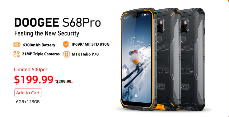 To continue, the second in line rugged phone is the S68 Pro which also comes with IP68/IP69K certifications as well as Helio P70 SoC backed by 6GB of RAM and 128GB of storage. It comes with Android 9 Pie pre-installed and can withstand temperatures ranging from -40° C to 60° C! It’s $100 off its original price so you can get it for just $199.9 here.