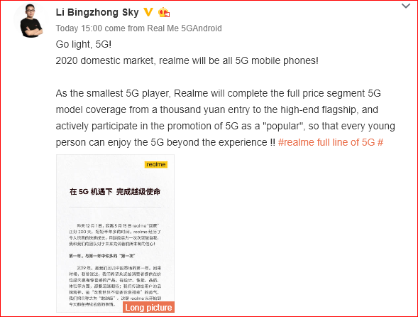 Realme first opened shop as an offshoot of OPPO in India and later on, the brand made its way to its home market – China. It has been a success all the way since then both on the home front and on foreign turf. However, Realme’s CEO/Founder has announced a major policy change that may likely change the landscape of the Chinese smartphone market from next year. The CEO disclosed via a Weibo post that from 2020, the company will only release 5G mobile phones in the domestic market. He did specify that the brand will pull the plugs off 4G phones from next year.