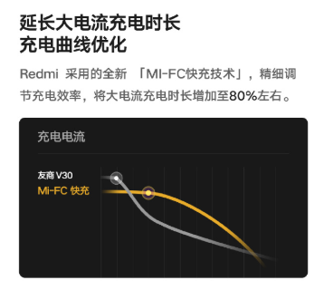 Redmi released an image explaining the technology behind the 30W Fast Flash Charge. Apparently, it uses it what is called MI-FC technology which was developed by Redmi. This allows the duration of charging at a high current to be extended by up to 80%. Redmi says there is also an independent charging pump with an efficiency of 97%.