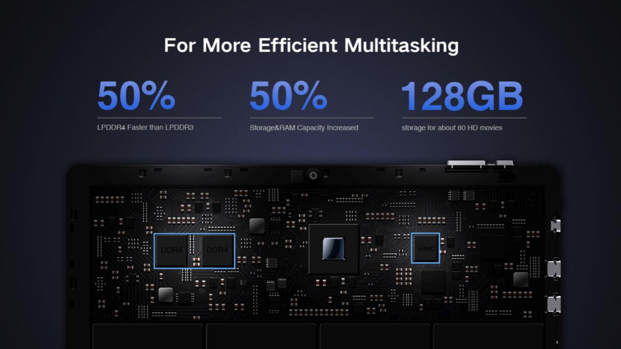 The overall performance has improved by 100% compared with the previous Atom Z8350. In addition, the new CPU uses less power than the previous model for even more hours of use on a single charge. What’s more, the N4100 is backed by 6GB of LPDDR4 RAM and 128GB SSD so that the Hi10 X can run fast and deal with multitasking efficiently. Of course, it supports storage expansion via the TF slot (up to 128GB).