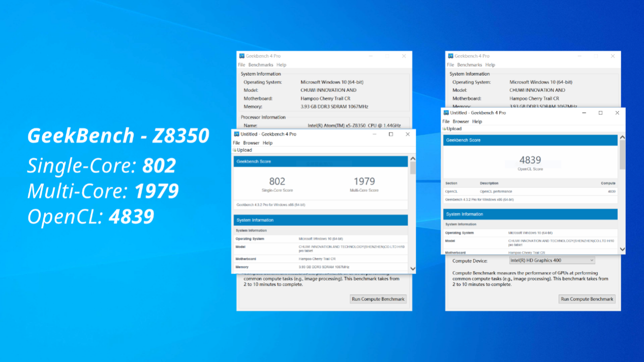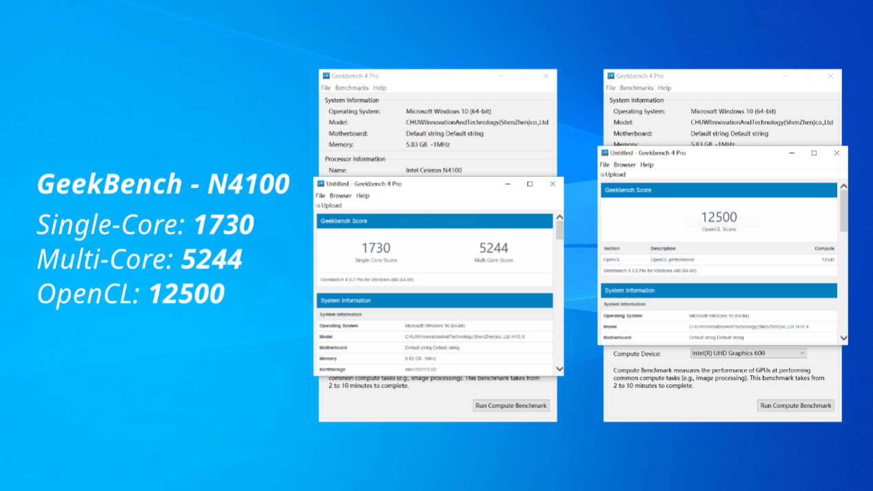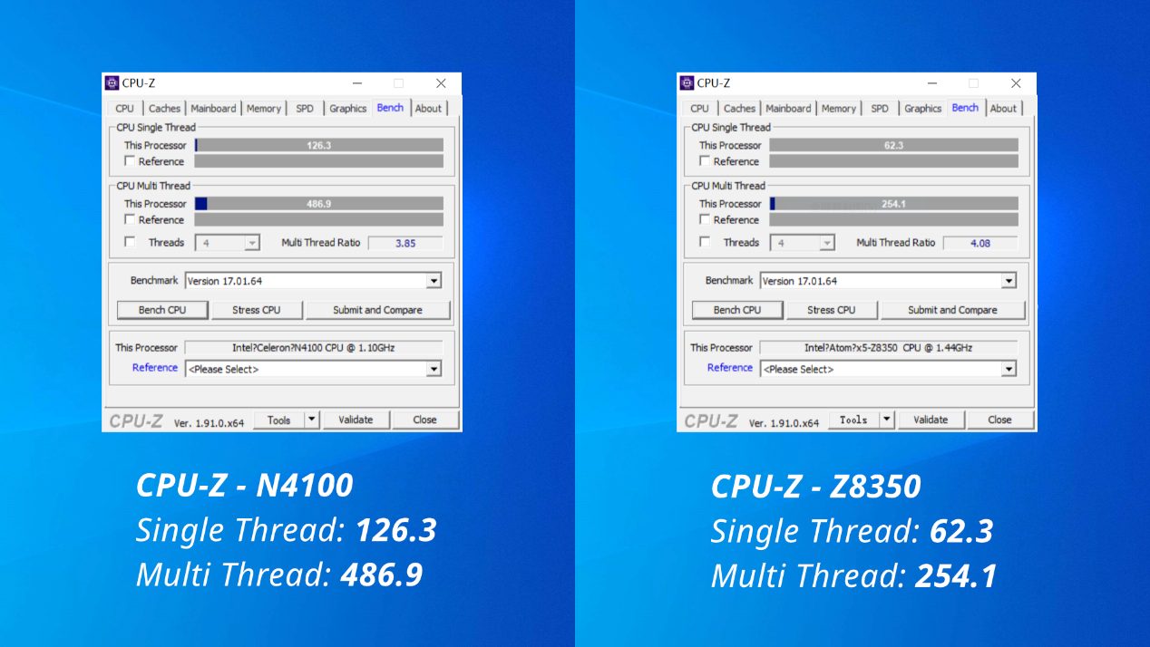 According to the CPU-Z information, Intel N4100 has a single-thread score of 126.3 and a multi-thread score of 486.9, which is much better than Atom Z8350. Also, in the GeekBench 4 test, the scores of Intel N4100 are twice better than Atom Z8350 with a single-core score of 1730, a multi-core score of 5244 and openCL score of 12500.