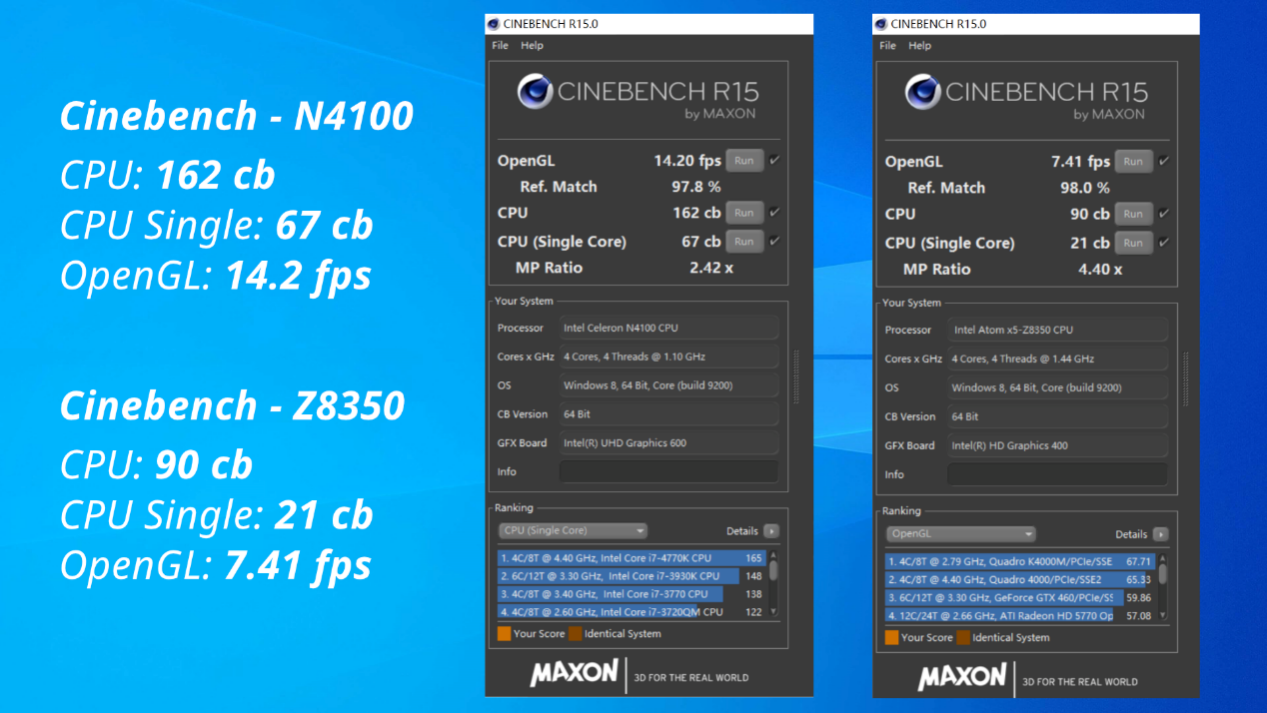 In other benchmark software such as CineBench R15, Intel N4100 also performs well with a performance boost of nearly 100% more.