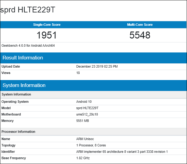 The Hisense model has all the dressings of a mid-range model. It packs a 6.5-inch TFT LCD display with an HD+ resolution of 1600×720 pixels. The device is powered by an unnamed processor clocked at 1.8GHz. The Geekbench listing indicates this is an octa-core UNISOC processor. With a single-core test score of 1951 and multi-core test score of 5548, the chipset is at best a mid-range SoC. The phone is listed to pack a 4850mAh battery.