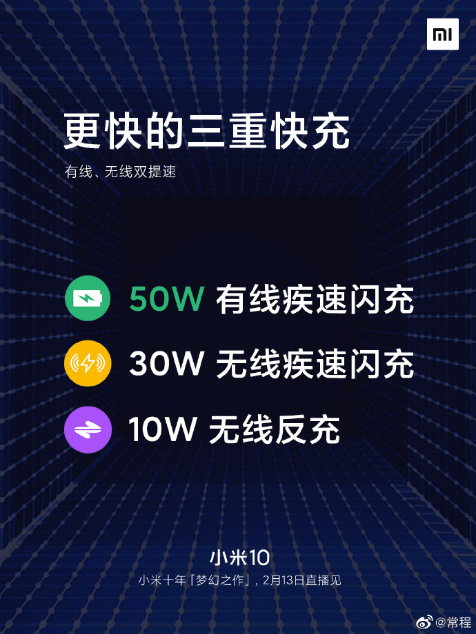Xiaomi Mi 10 is confirmed to pack a big 4500 mAh battery with 50W fast charging. The phone will support 30W wireless charging and 10W reverse wireless charging.