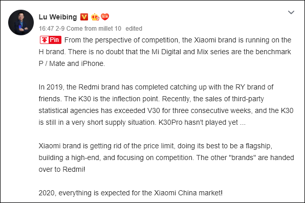 Now, the Mi-series models have not been this expensive, especially for the base variant. Lu Weibing has now clarified in his post that the Mi brand and MIX series are high-end brands in the same rank as the Huawei P/Mate series and Apple iPhones. He then added that the brand was getting rid of the price limit and is doing its best to be a flagship in order to compete favourably. The Xiaomi exec also made reference to the upper mid-range segment that is occupied by the Redmi K30 where it is the preferred choice ahead of the Huawei V30.