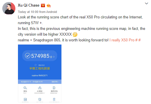 In January, a Realme phone with model number RMX2071 was spotted at AnTuTu benchmarks with a remarkable score of 574,985. At that time, it was believed that it could be the upcoming Snapdragon 865 mobile platform powered Realme X50 Pro 5G smartphone. Recently, Realme Vice President and President of Global Marketing, Xu Qi had shared a screenshot of the Realme X50 Pro 5G phone that revealed some of its key specs. The screengrab confirmed that the model number of X50 Pro 5G as RMX2071. Xu Qi today confirmed that the previously seen of AnTuTu listing belonged to the pre-production unit of the smartphone. He added the final product will score higher on AnTuTu benchmarks.