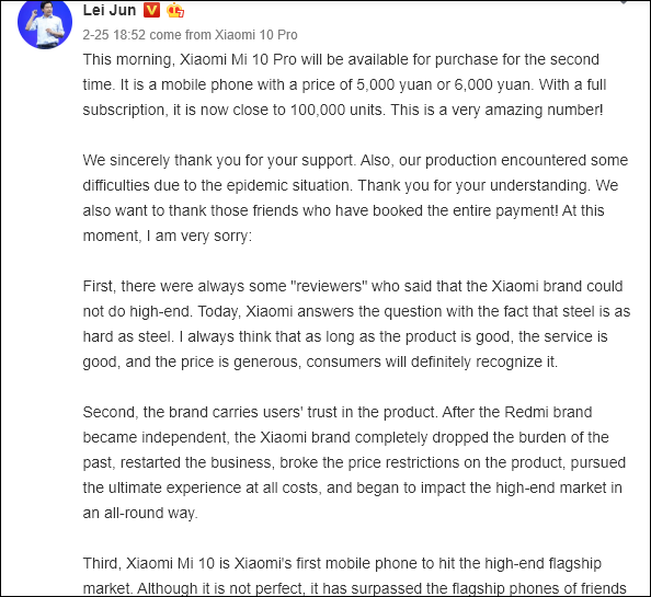 Xiaomi recently announced that it would be putting up the Mi 10 Pro high-end version for sale across various channels on Tuesday (February 25). Indeed, the flagship model went on sale in China. Concerning the sales, the company’s CEO Lei Jun disclosed in a Weibo post yesterday that close to 100,000 units of the model have been sold.
