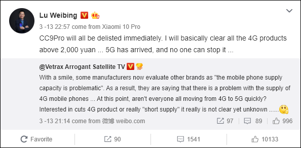 Xiaomi VP and Redmi GM Lu Weibing disclosed a couple of days back that the Mi CC9 Pro and all other models with prices ranging from 2000 yuan (around $285) and above will be delisted right away. This means the company is planning to remove all 4G phones in, not just the flagship segment but all in the premium mid-range segment.