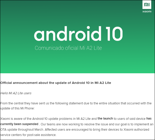 In addition, Xiaomi is encouraging A2 Lite users whose models were bricked by the botched Android 10 update to take the units to authorized Mi service centres or return them to retailers for post-sales assistance (RMA).