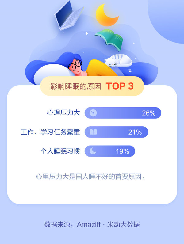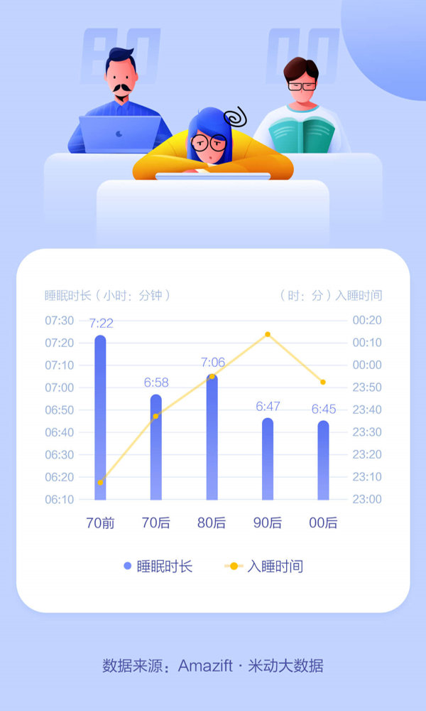 Compared to 2018, the average sleep score of Chinese people increased slightly in 2019, and sleep duration increased slightly. In 2019, the average Chinese sleep score was 82 points, and the average sleep duration was 5 minutes longer than in 2018. However, more persons stayed up late in 2019 than in 2018. The average time to sleep is 23:55, which is 5 minutes later than 2018 and 32 minutes later than the 2017 figure.