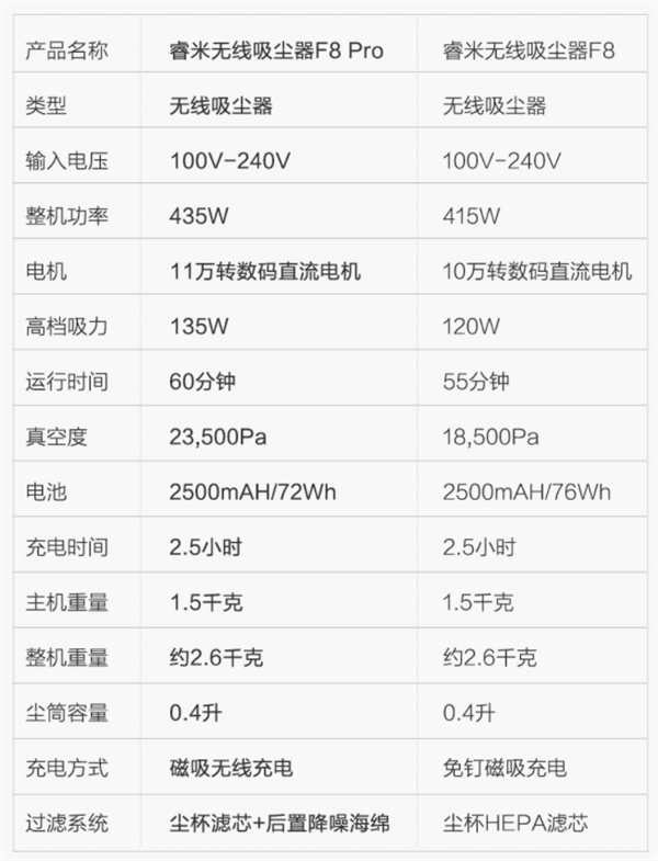 The Roidmi F8 Pro Handheld Vacuum Cleaner is an upgraded version of the Roidmi F8. The gadget sees its suction power upgraded from 115W on the F8 to 135W. The number of filters is also increased from four to five on this model. Apart from that, the battery also received a bump and can now endure up to 60 minutes of use, up from 55 minutes on its predecessor. Although both models pack a 2500mAh battery, the power consumption is reduced from 76Wh on the F8 to 72Wh on the F8 Pro.