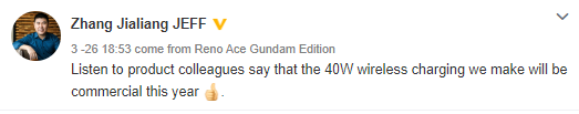 The chief scientist of the OPPO VOOC Flash Charge department revealed today on Weibo that Reno Ace 2 will support 40W fast wireless charging technology. It won’t be the first ever to arrive with the rapidest wireless charging feature. The premium Huawei P40 Pro+ smartphone that debuted yesterday is the first ever phone to come with 40W wireless charging support.