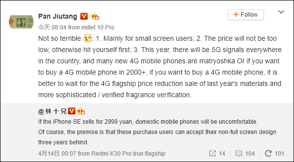 As for the pricing, Pan Jiutang believes Apple won’t bring the price of the upcoming iPhone very low so that it doesn’t affect the sales of the pricier models. He also threw in a tip for intending buyers, drawing attention to the fact that 5G phones will soon dominate the market and as such, the prices of 4G flagship models will soon fall around the 2000 yuan margin. Thus, he advised intending buyers to wait in order to get such 4G phones which obviously have better specs. If the iPhone SE which is going to be a 4G phone should sell for the 2,999 yuan (around $400), it will be a popular one. But we expect Chinese OEMs to immediately crash their phone’s prices to offer users better hardware for similar price points.