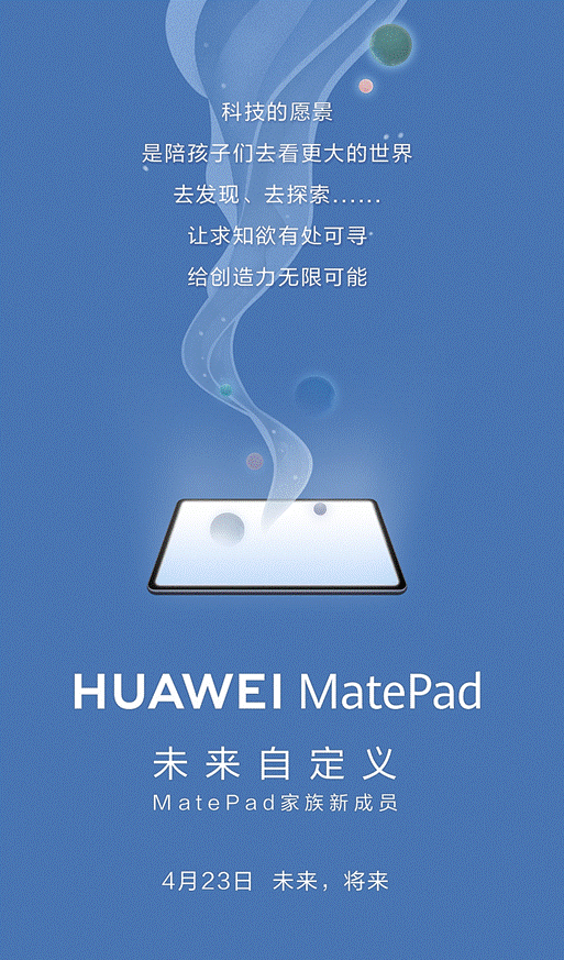 Huawei has released a poster on Weibo which confirmed the MatePad will be launched on April 23. The company had earlier fixed the Nova 7 series launch for that same date meaning more than one product will be unveiled on that day.