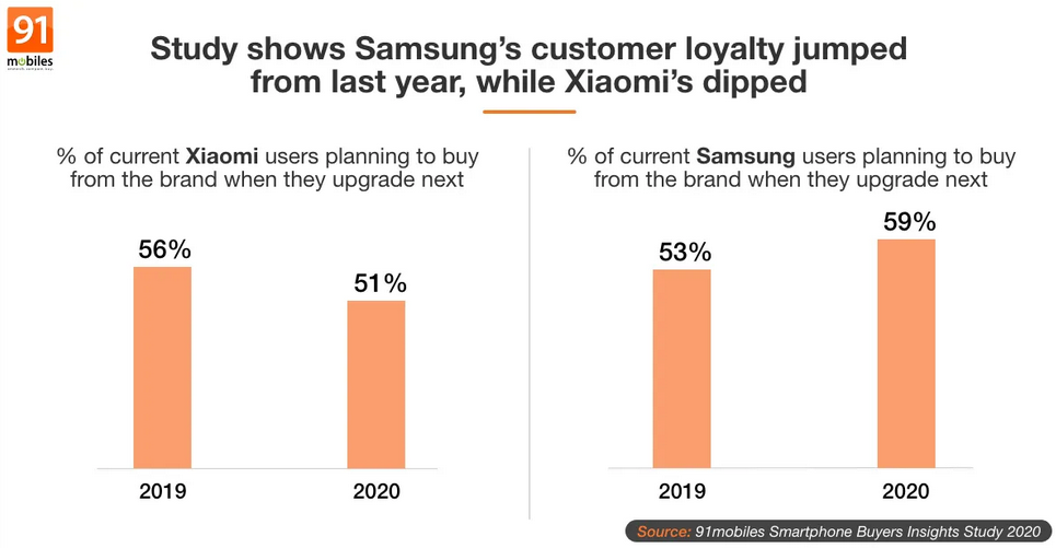 Samsung saw an increase from 17 percent in 2019 to 24 percent in 2020, while Xiaomi saw a decrease from 24 percent in 2019 to 20 percent in 2020. Thus, the trend is indicative of a complete switch in positions in the market. Similarly, the survey also included the criteria of brand loyalty or sticking by your favorite brand with your next upgrade. Here again, Xiaomi saw a decrease, down from 56 percent in 2019 to 51 percent in 2020. On the other hand, Samsung saw a rise from 53 percent in 2019 to 59 percent in 2020.