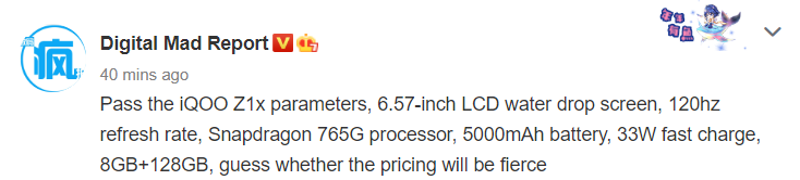 The iQOO Z1x will be arriving with an internal storage of 128 GB. As it was revealed yesterday, the Z1x will be backed by a 5,000mAh battery. Its 3C appearance revealed that it could be shipping with a 33W rapid charger. According to another tipster, the smartphone will be flaunting a 48-megapixel primary camera on its back. Probably, the phone will be fitted with a triple camera system.