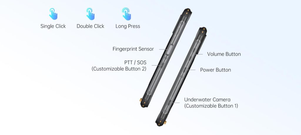 Umidigi Bison comes with two independent customizable buttons which can be used for Push-to-Talk, underwater camera mode, and emergency call. It can be assigned different features for single click double click and long press functions.
