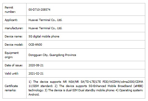 It is believed that the OCE-AN00 model number belongs to the Huawei Mate 40 handset. The letters ‘OCE’ refers to its ‘Ocean’ codename. The NOH-AN00 Huawei phone could be the Mate 40 Pro smartphone. The ‘NOH’ letters in the model number are the short form of its “Noah’ codename.