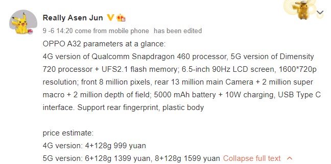 In Indonesia, the OPPO A53 arrived with pricing of IDR 2,499,000 (~$169). As can be seen in the above screenshot, the tipster has speculated the OPPO A32 could be priced at 999 Yuan (~$146), whereas its 5G version could be costing 1,399 Yuan (~$205).