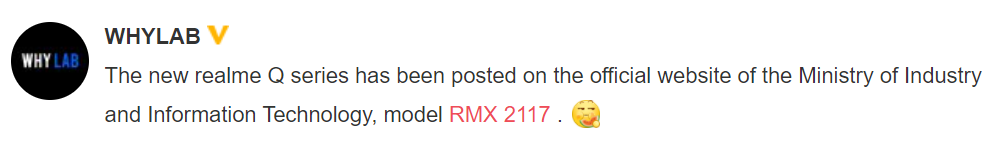 It has a front camera of 16-megapixel and its rear has a 48-megapixel + 8-megapixel + 2-megapixel triple camera system. The phone houses a 5,000mAh battery and it weighs 194 grams. The handset could be priced around 1,500 Yuan (~$221) in China. It is speculated that the Realme RMX2117 will debut as a Realme Q series phone.