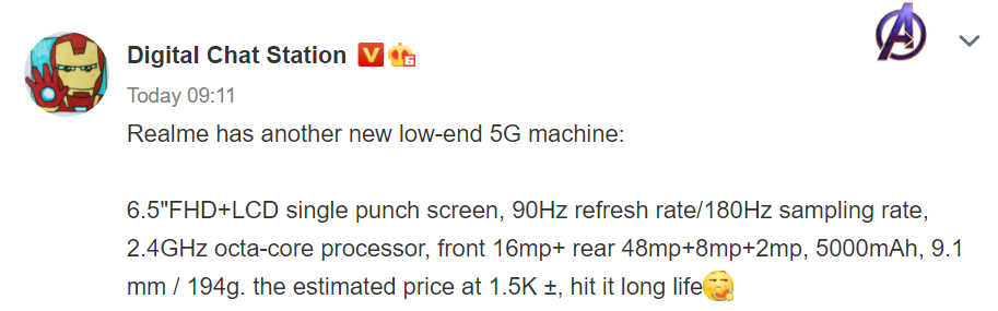 Reliable tipster Digital Chat Station has more details on the specs of the RMX2117 smartphone. He revealed that its 6.5-inch LCD panel has a punch-hole design and supports Full HD+ resolution, 90Hz refresh rate, and 180Hz sampling rate. It is driven by an octa-core processor that ticks at 2.4GHz.