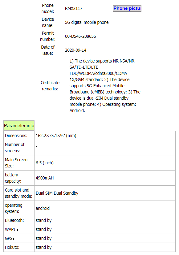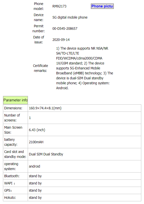 The Realme RMX2173 and RMX2117 are 5G-ready smartphones heading towards Chinese markets. Currently, the TENAA listing of the RMX2117 shows that it measures 162.2 x 75.1 x 9.1mm and it features a 6.5-inch display. The phone is equipped with a rated battery of 4,900mAh capacity. On the other side, the Realme RMX2173 has 160.9 x 74.4 x 8.1mm dimensions and it is fitted with a 6.43-inch display. The device is backed by a dual-cell battery and the rated capacity of one of its battery is 2,100mAh.