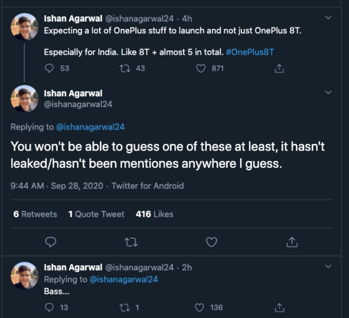 According to the tipster, OnePlus is planning to unveil “almost five” other products alongside the OnePlus 8T. The tipster didn’t share any detail as to what the products are and even assured that we won’t be able to guess one of the products as they have not featured in any leak as of this moment.