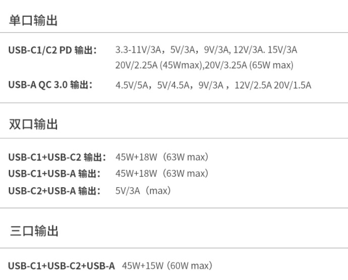 The ASUS Adol Gallium Nitride Adapter comes with a three-port design which includes dual USB-C ports and a USB-A port. It equally supports PD3.0 protocol and has a maximum output power of 65W.