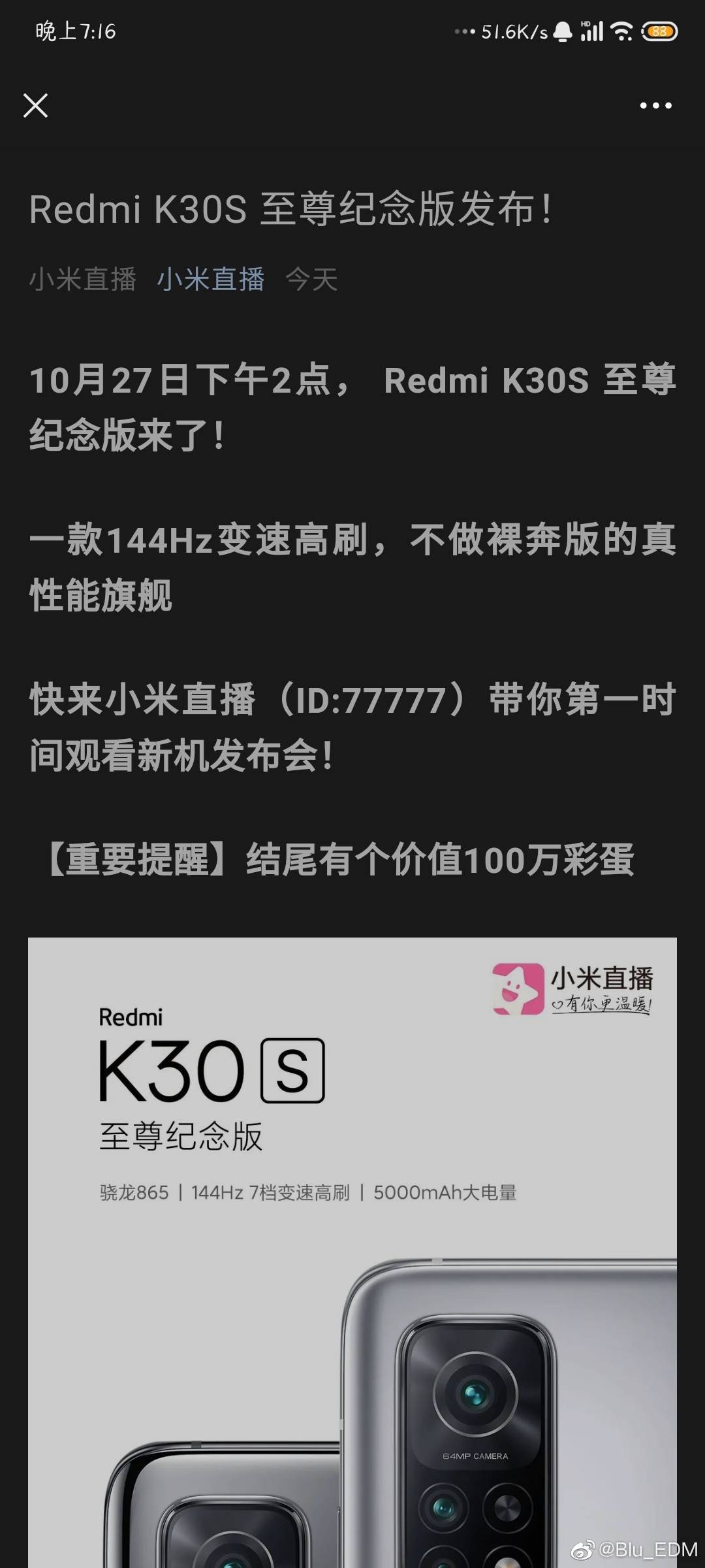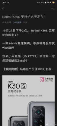 While reports have been claiming that the Redmi K30S will go official soon in China, Redmi is still mum on its arrival. A couple of leaks that have appeared on Weibo today states that the Redmi K30S is all set to go official on Oct. 27.