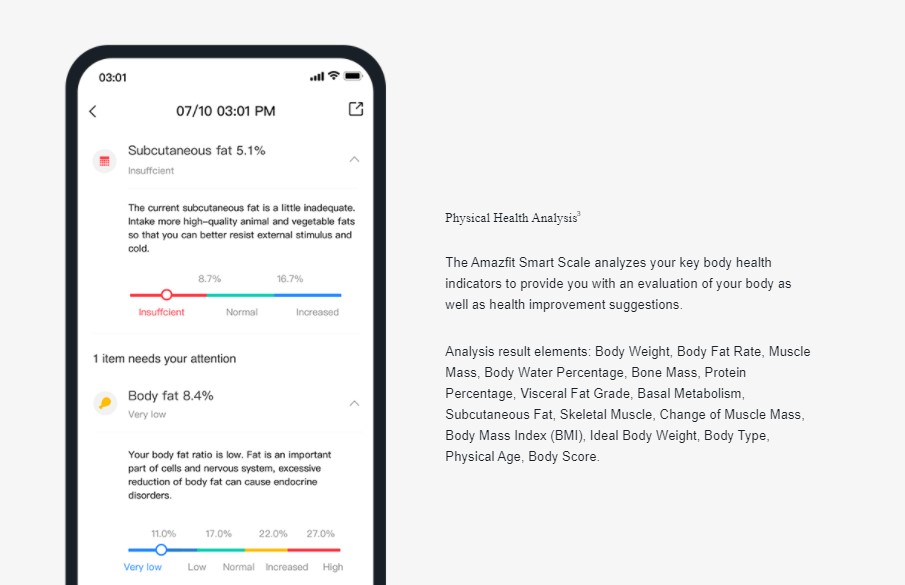 The Amazfit Smart Scale measures not only weight but also 15 other body health metrics including body fat range, muscle mass, body water percentage, bone mass, physical age, visceral fat, and body type. It is able to achieve this thanks to its high-precision data processing chip.