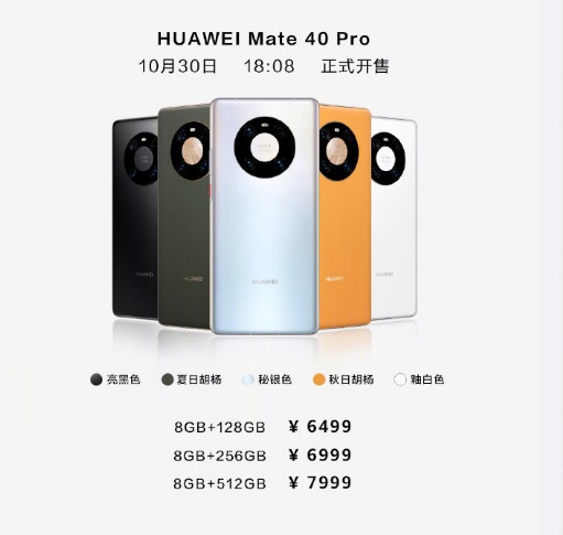 - Huawei Mate 40 Pro 8GB+128GB version – 6499 yuan (~$972)