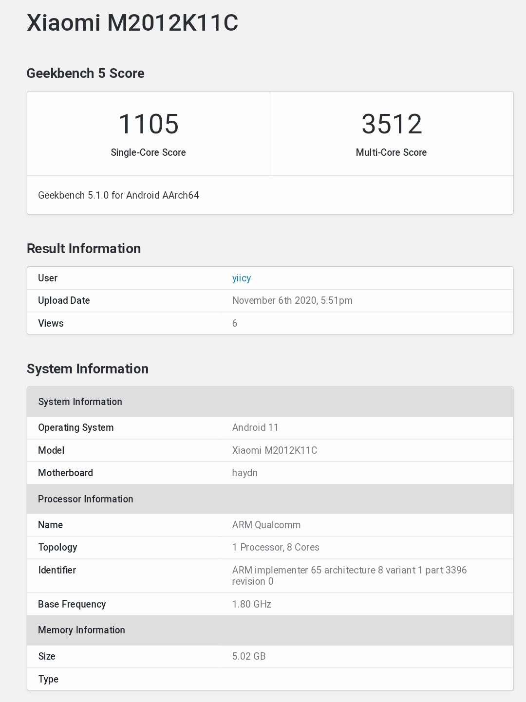 As reported by dealntech, a Xiaomi device with codename M2012K11C has hit the Geekebench. Accordingly, the motherboard is coined “Haydn”. On digging through the source code of the Geekbench listing, we see that the Processor is indeed Snapdragon 875. This is because the cores of the CPU listed inside fall in line with the earlier leaks. It shows that the Processor has 1.8GHz, 2.42GHz, and 2.84GHz.