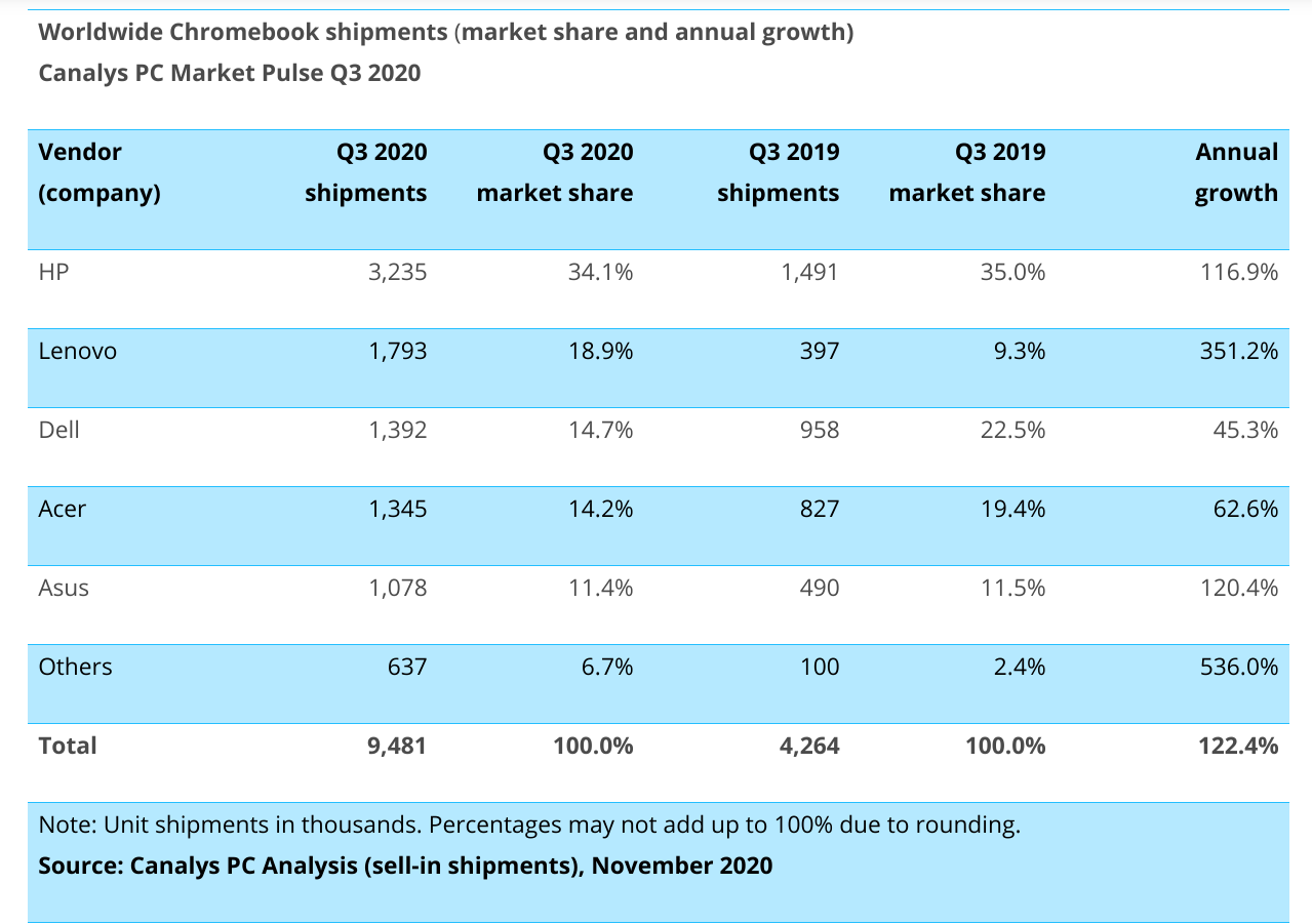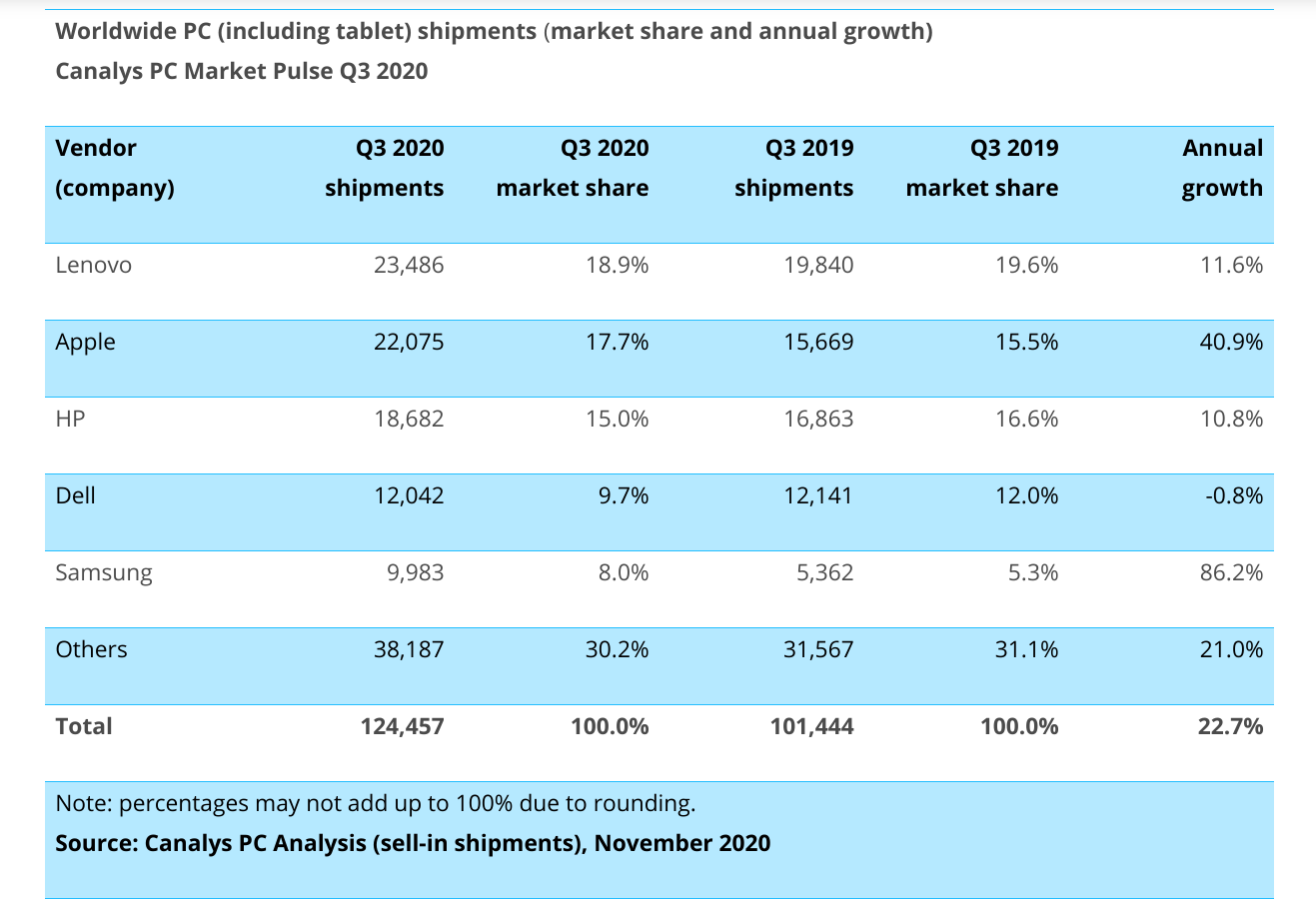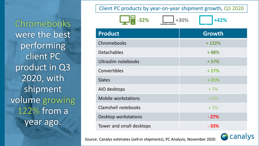 Canalys has published a report on Global PC Market Q3 2020. This report not only consists of notebooks and desktops but also includes tablets. According to it, the entire market grew by 23% YoY with 124.5 million units in shipments. Chromebooks were the best-performing client PC product and the tablet market remained strong second quarter in a row.