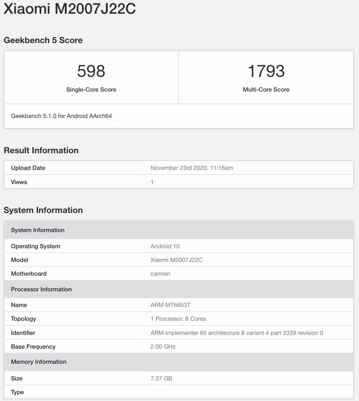 Anyway, the listing shows the device in testing runs with 8GB RAM and runs Android 10. This suggests that the device could debut with MIUI 12 based on Android 10 out of the box. The device in question scores 598, 1793 points in Single and Multi-core Scores respectively. Now, if we recall, the Redmi Note 9 5G’s sibling had visited Geekbench listing a while ago with Snapdragon 750G SoC that has been confirmed by the company recently.