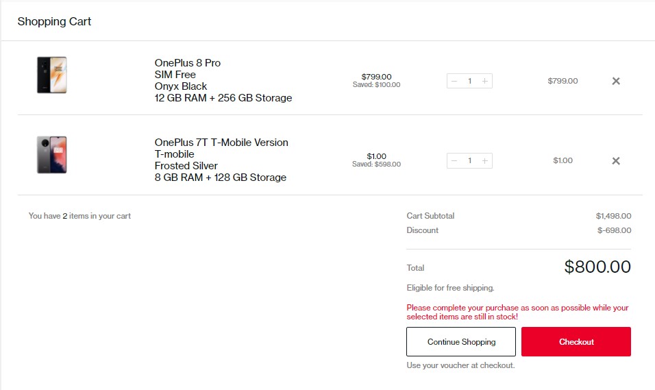 Killer deal indeed to make this Black Friday remarkable. OnePlus monikered the deal as OnePlus’ 2 For 1 Black Friday offer for users in the USA. Availing the offer is straightforward, all you’ve to hit OnePlus.com and add the OnePlus 8 Pro ($799) to your cart. Then, add the T-Mobile OnePlus 7T also to your cart. As soon as you add the second device to your cart, its rate changes to just $1 instead of the current selling price of $350. Literally making the total cost – $800 instead of the $1,149 it would have been otherwise.