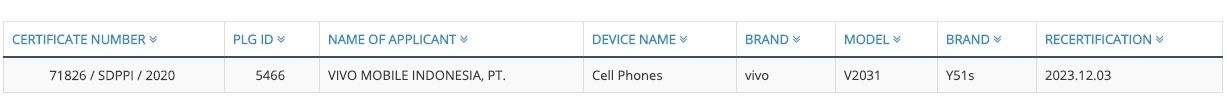 According to the report, a Vivo device with model number V2031 has been listed on Russia’s EEC certification portal. Additionally, the device has reportedly obtained Indonesia’s SDPPI certification as well. Here, the listing on SDPPI shows that the marketing name of the device is Vivo Y51s. To compare, Vivo Y51 that got certified in Indonesia has a model number V2030.