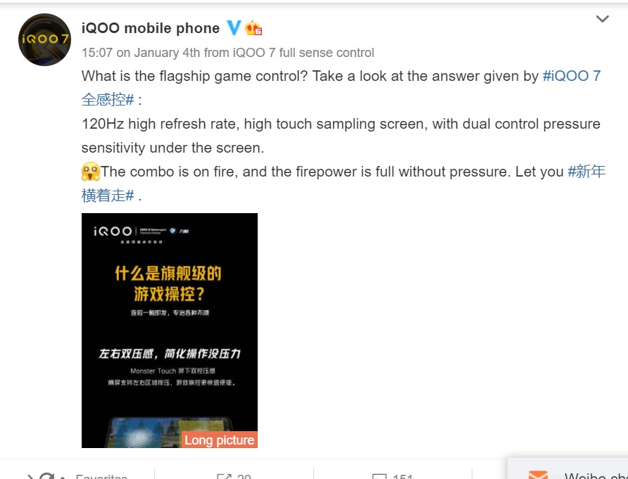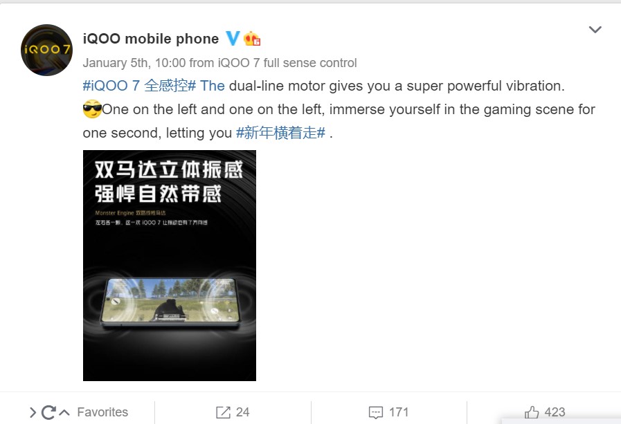iQOO on Weibo, Shared a Video(via) to depict the features of the device. Precisely, the iQOO 7 will feature Dual- Linear Motors with one on the left and right side when held in Landscape mode. This coupled with a Monster Engine will help the device function like a Gamepad in giving feedback vibrations.