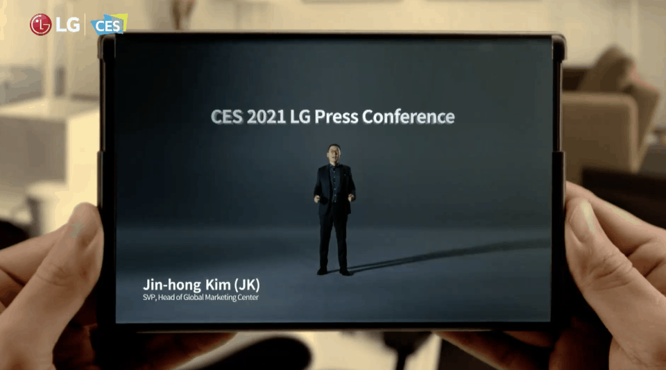 LG basically used the rollable smartphone seemingly held by someone to project the “virtual” stage at its event with Jin-hong Kim who is the SVP and Head of Global Marketing at LG speaking at the event.