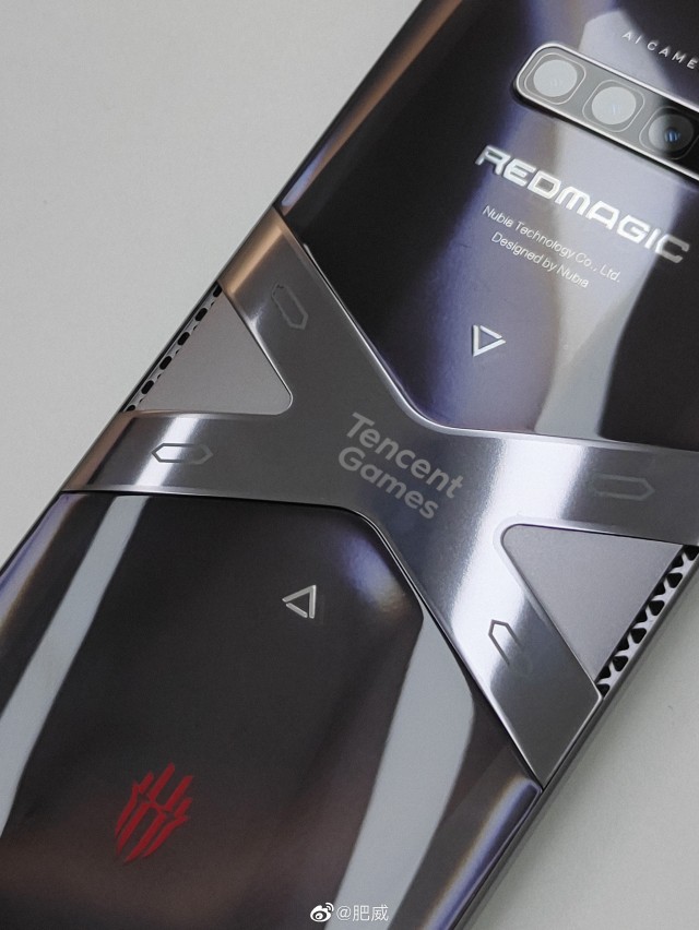 Besides, if you recall, the Red Magic 5S had a vertical Triple-camera arrangement. Anyway, looking at the rest of the image, we can see the device in Gray color having an X-shape in the middle with silver accents. The top of the layout has ‘AI Camera’ and Nubia branding beneath and a ‘Red Magic’ at the bottom.