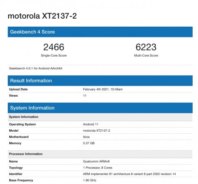 The GeekBench details align with those previously spotted on Moto Ibiza’s listing on the Wi-Fi Alliance database which shows it features dual-band Wi-Fi connectivity and runs Android 11.