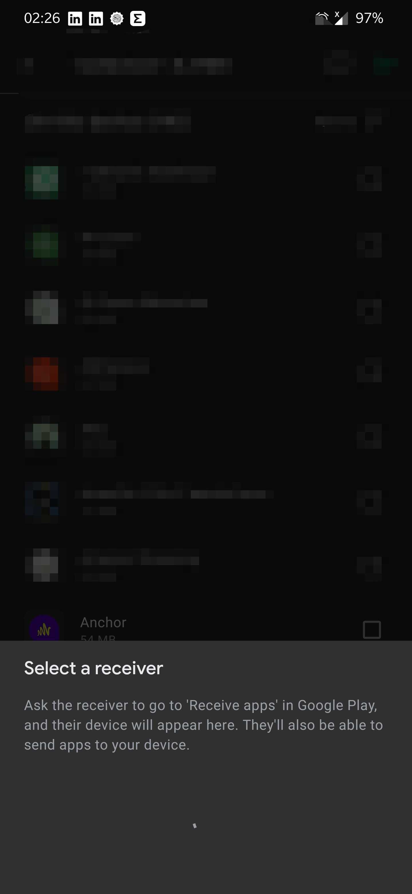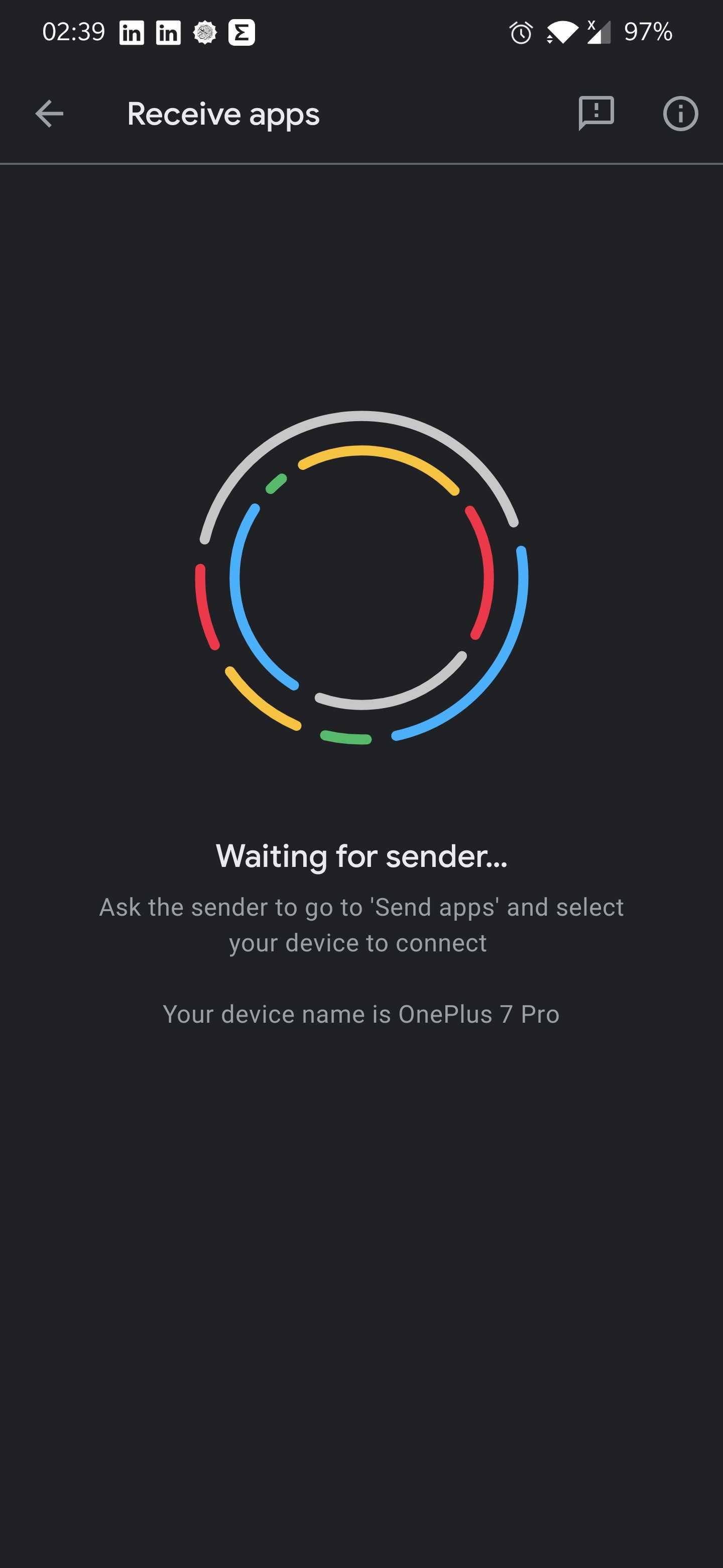 Regardless of which you choose, you will be asked to turn on location services. If you choose to send, you are taken to a screen that lists all your installed apps. Select which app(s) you want to send and press the green button at the top right corner. Your phone will begin to search for nearby devices. If you choose to receive, you get an interface similar to the last image above.