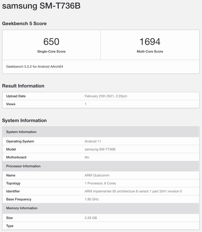 The SM-T736B variant of the Galaxy Tab S7 Lite has been spotted with a processor that is codenamed as ‘lito’ on Geekbench 5. The Qualcomm chip offers a base frequency of 1.80GHz. The SoC is coupled with 4 GB of RAM and the device runs on Android 11 OS. In the single-core test, the device scored 650 points and it reached a score of 1694 points in the multi-core test.