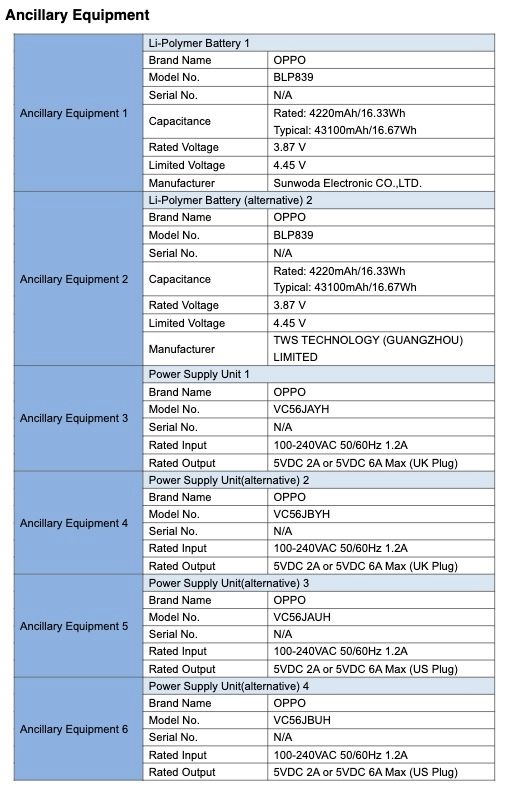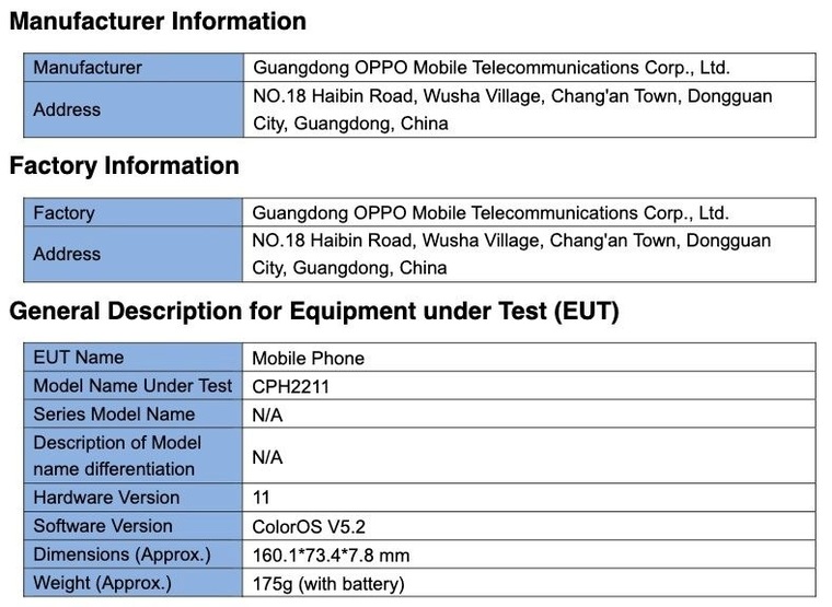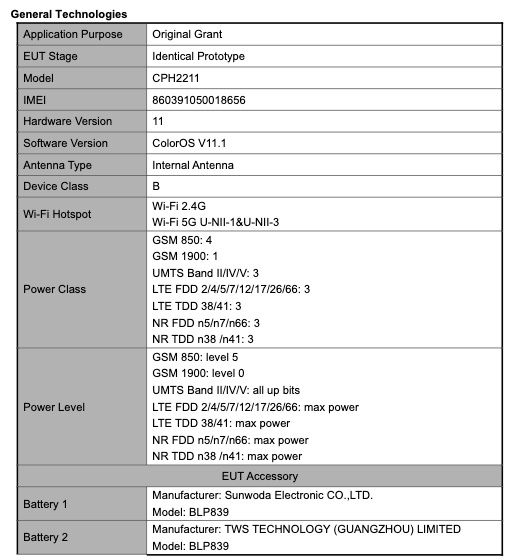 The Reno 5Z has appeared with its CPH2211 model number at FCC. The listing reveals that it measures 160. 1 x 73.4 x 7.8mm and it weighs 175 grams with the battery. Speaking of battery, the FCC documents mention that the device is powered by a 4,220mAh battery (model number BLP839). The phone may ship with a VC56JAYH charger that supports up to 30W charging.