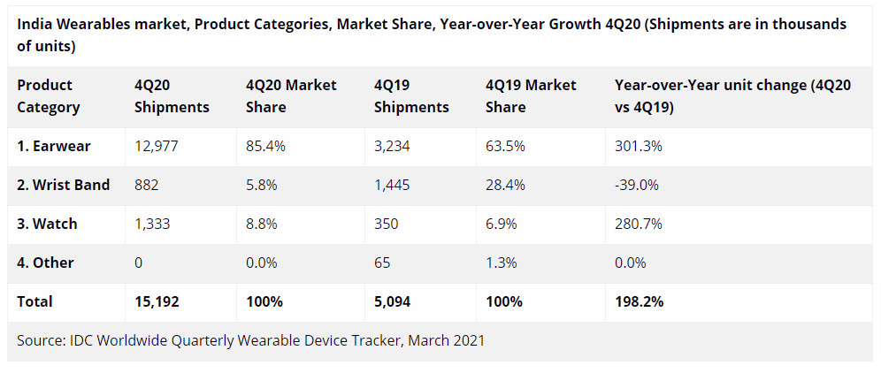The last quarter recorded the biggest quarterly figures for wearables in India. Overall, an estimated 15.2 million units were shipped in Q4 of 2020, thereby outclassing its 2019 performance by 198.2%. This was the first quarter when shipments of watches exceeded a million units (1.3 million units were shipped).