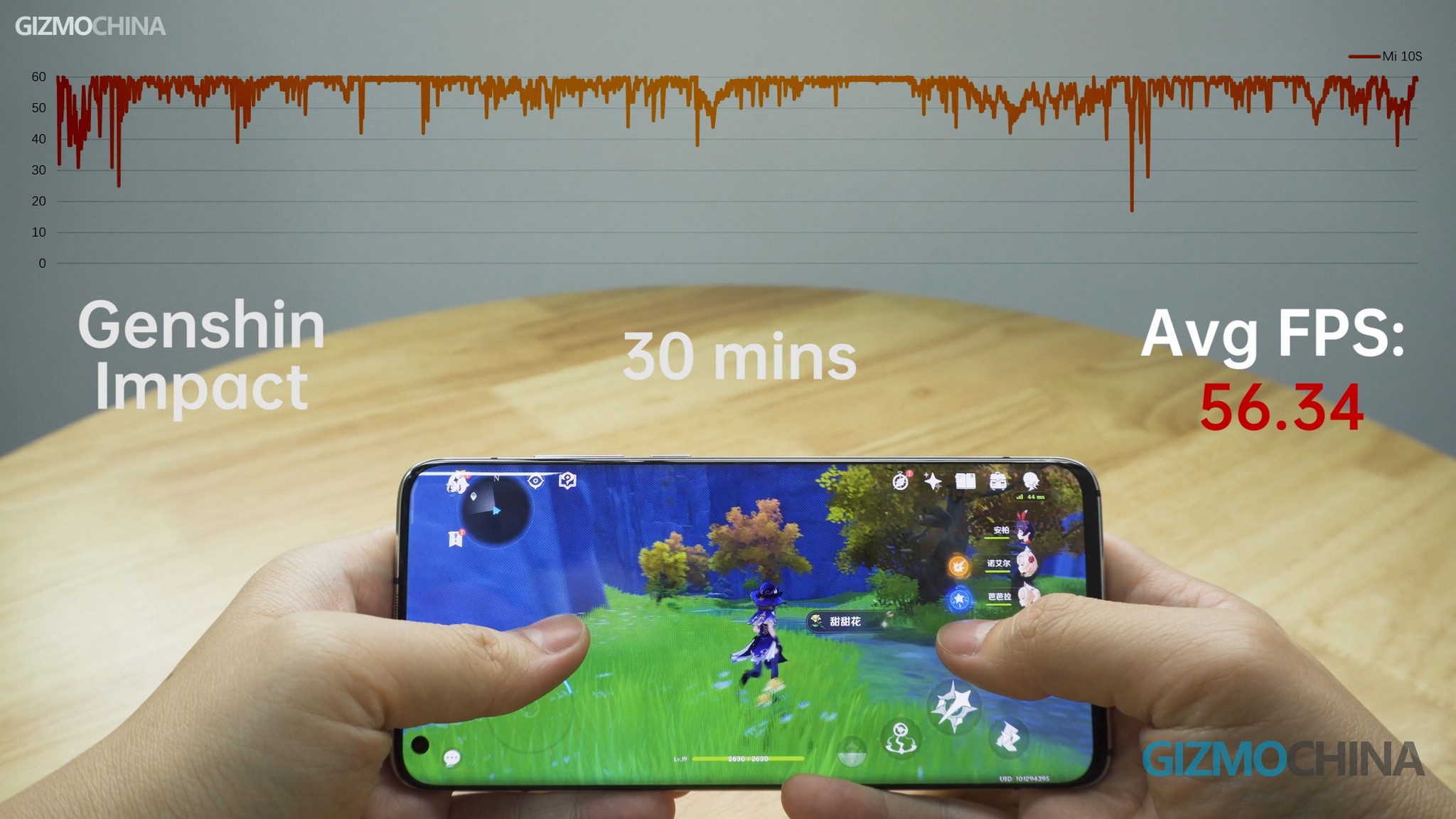 One area where the Mi 10S surprised us the most was Gaming. PUGB gameplay was very smooth with a consistent frame rate of around 89 fps. The frame rate graph was like a straight line, which was very impressive. Clearly, such a high frame rate isn’t an issue for the Snapdragon 870. Then we played Genshin Impact at the highest quality setting. The magic happens once again, with an average frame rate of 56 fps, which is higher than many Snapdragon 888 phones. We got 30 minutes of gameplay without a downgrade in the frame rate.