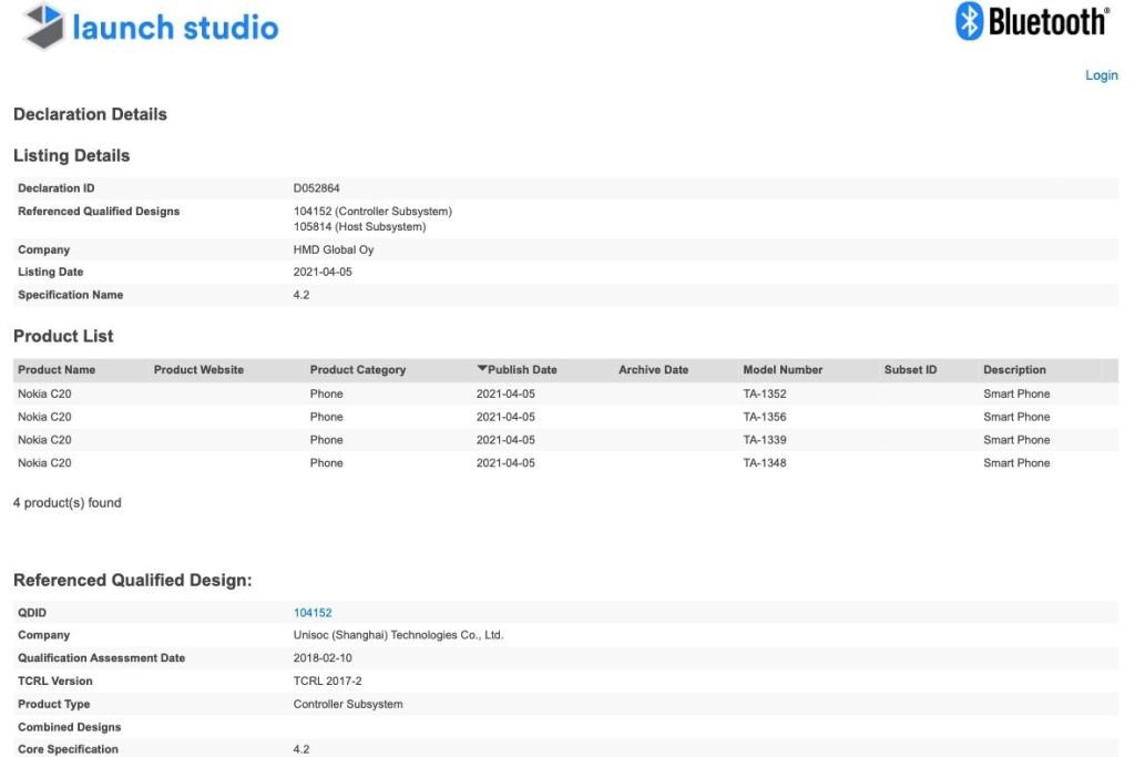As reported by MySmartPrice, four models of HMD Global Oy smartphones TA-1339, TA-1348, TA-1352, TA-1356 appear on the Bluetooth SIG website. All of them are certified as Nokia C20.