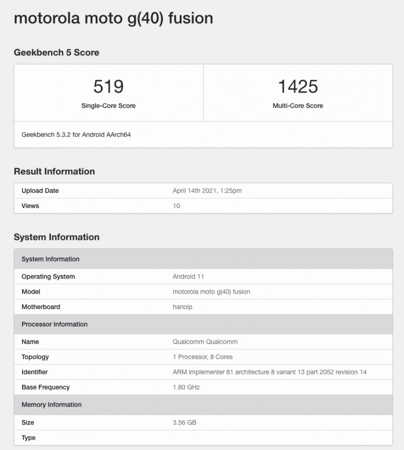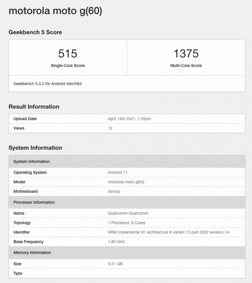The Geekbench listings show that the Moto G60 and Moto G40 Fusion are powered by the Snapdragon 732G. While the name of the SoC is not explicitly mentioned in the listings, a couple of leaks have claimed that the Moto G60 and G40 Fusion by the SD732G chip.