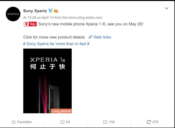 Yesterday, Sony unveiled the new Xperia 1 III and 5 III flagship devices. Later that day, the company took to Weibo to confirm the launch date of the device in China.